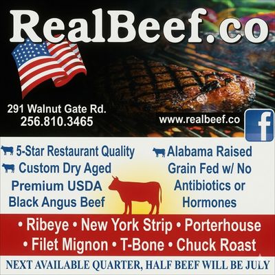 If you are thinking about buying bulk beef reach out to me and I will be glad to answer any questions you may have. Our beef is grain finished for a minimum of 150 days to produce excellent flavor and tenderness that you can not buy in the grocery stores. No antibitoics or growth hormones are used, dry aged 14 days. Spots fill fast. $100 deposit. Call ot text 256-810-3465